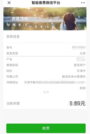 點(diǎn)擊繳費(fèi)充值,如果綁定了多塊水表,左右滑動(dòng)選擇要繳納水費(fèi)的表具后點(diǎn)擊繳費(fèi)按鈕。如圖