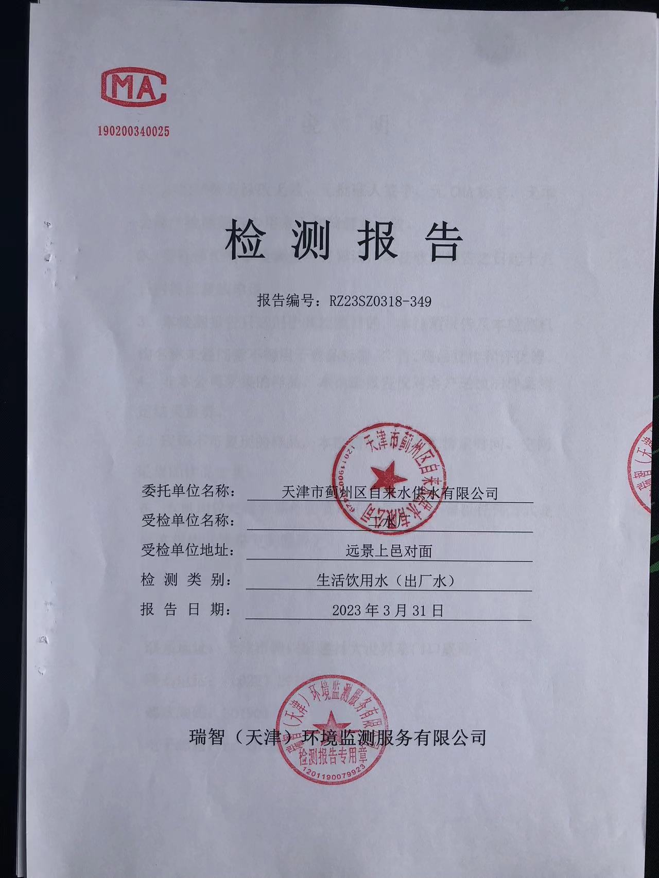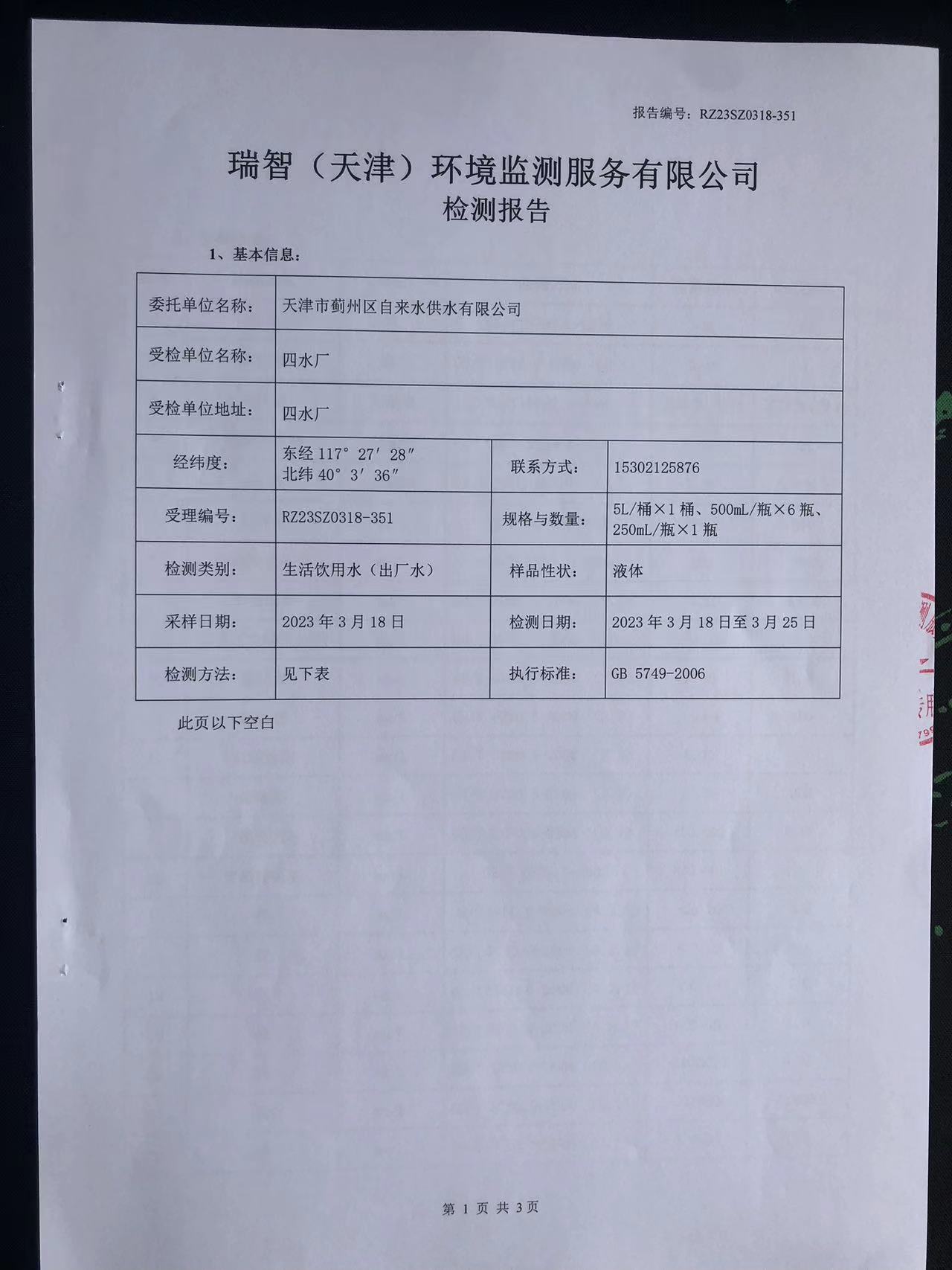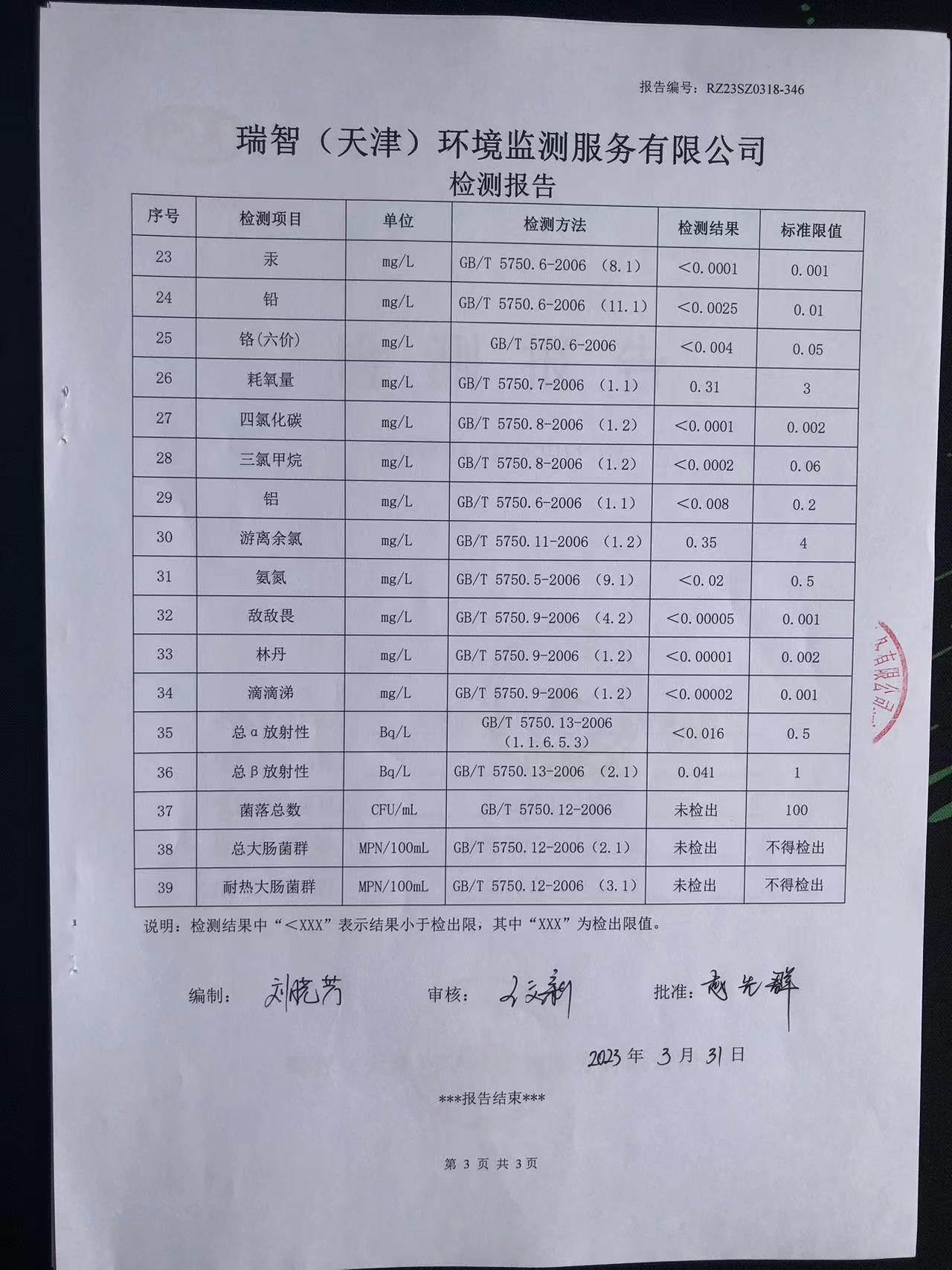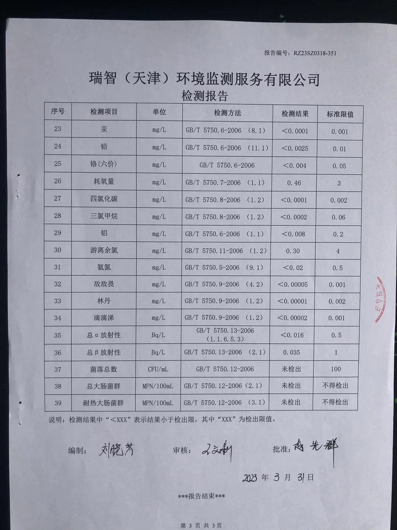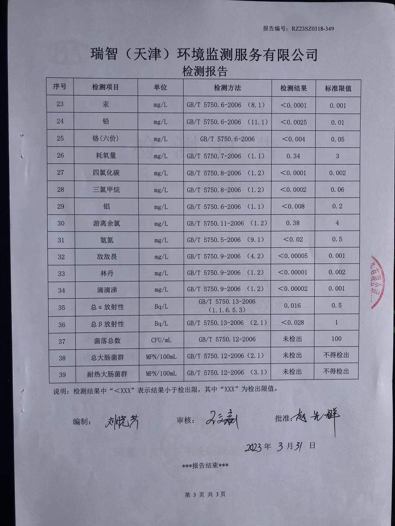 2023年3月份水質(zhì)檢測(cè)報(bào)告