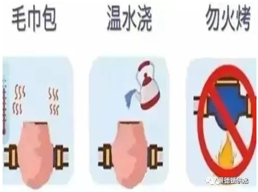1、對(duì)已凍住的水龍頭、閥門、水管,用戶可以用熱毛巾裹住水龍頭,然后澆灑溫水,使水龍頭解凍再擰開水龍頭,用溫水沿水龍頭慢慢向管子澆灑,使水管解凍。切忌用火燒烤或用開水激燙,這樣反而容易導(dǎo)致水管爆裂。  2、如果是家中水表受凍結(jié)冰,切忌用過(guò)熱的開水直接沖淋水表表面,應(yīng)使用不超過(guò)50攝氏度的溫水沖淋,切忌用火烘烤。如水表表面玻璃已經(jīng)凍裂,用戶要立即與天津市薊州區(qū)自來(lái)水供水有限公司聯(lián)系。