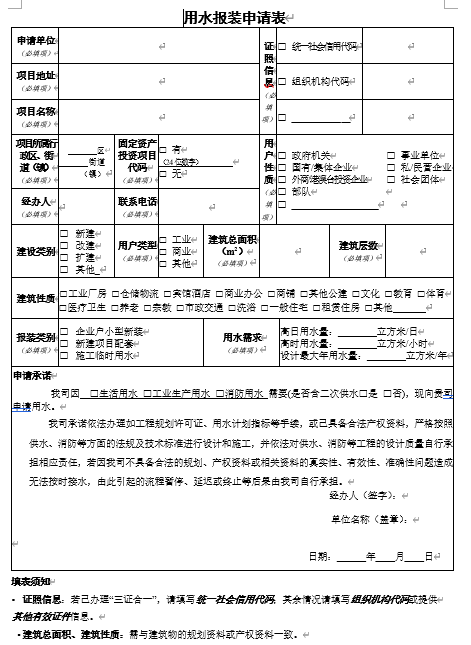 全面推行用水報(bào)裝承諾制,實(shí)行供水接入工程報(bào)裝申請(qǐng)“零材料”和“一表式”辦理,用水單位只需提供《用水報(bào)裝申請(qǐng)表》(附件1),對(duì)相關(guān)內(nèi)容做出承諾即可申請(qǐng),不再要求提交建設(shè)工程規(guī)劃許可證、施工圖審合格證明、用水計(jì)劃指標(biāo)等材料。